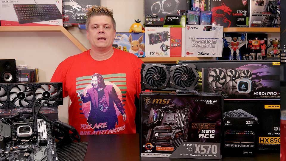 We just finished a How-to-Overclock Ryzen guide for MSI here, and from that we got our hands on a whole setup. So thanks to MSI, we have an MEG X570 Ace motherboard for testing, a Ryzen 3900X CPU, and a Corsair H150i Pro 360 mil AIO cooler, which is best case scenario for both of these CPUs. Both the X570 ACE and our Z390 Tomahawk have the latest BIOSes installed, and the latest system and NVIDIA drivers, just ripe for Intel vs our AMD 3900x testing.