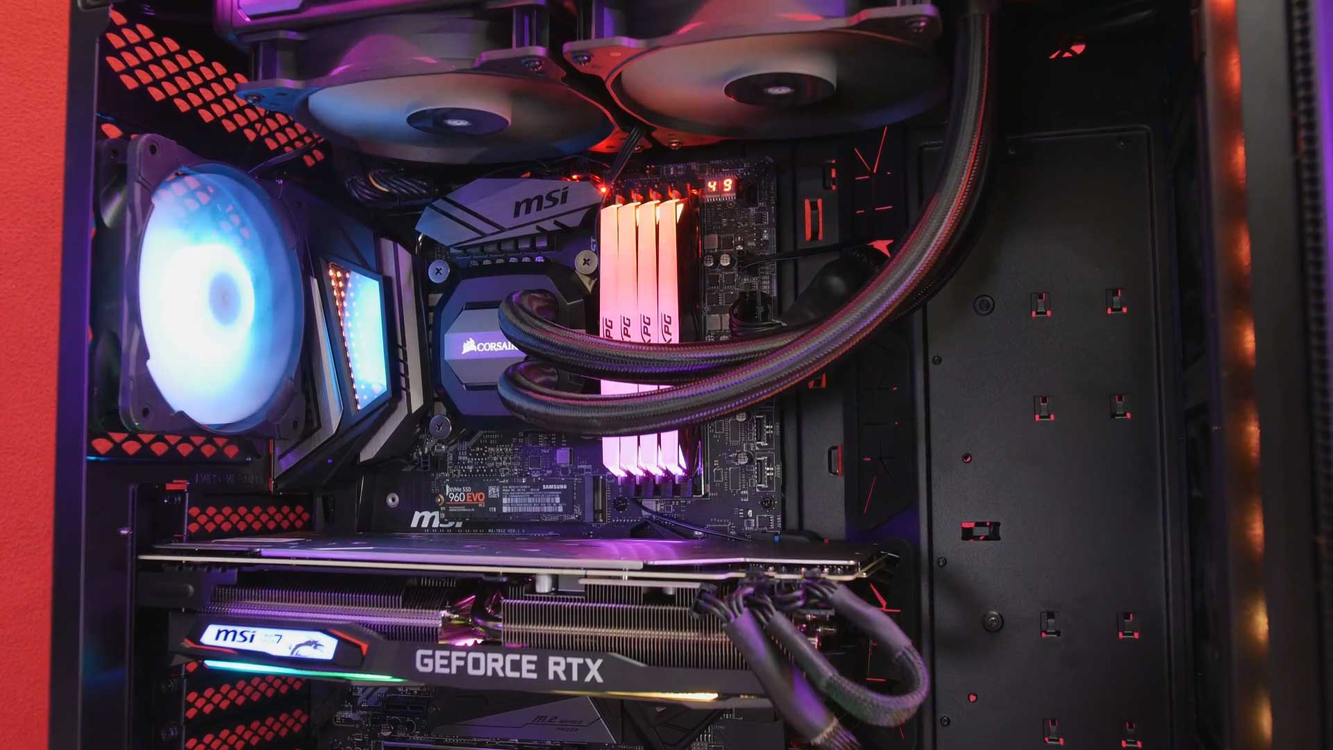 Building in this case went fairly smoothly, we used the MSI ACE z390 motherboard with our i9-9900K CPU. The ACE z390’s Infinity mirror chases on the left, complementing the 32 gigs of XPG D41 RGB DDR4 that ADATA kindly lent us for this build. System drive is a Samsung 960 EVO 1 terabyte m.2 drive, with cooling done by the Corsair h115i 280 mil rad. And graphics are handled by an MSI GeForce RTX 2070 GAMING Z 8G, with power supplied by the Corsair RM850x.