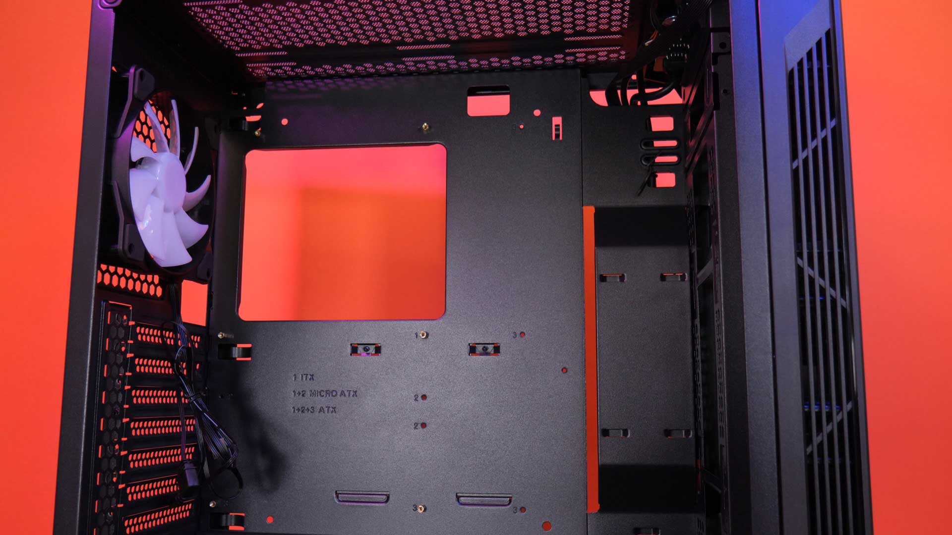 And the rear preinstalled 120 mil ARGB fan can travel up or down by 2 centimeters. The motherboard tray has a decent cutout area for easy access to CPU mounting solutions. The PSU cover has a single cutout for wire pass-through, and to the right there’s a cutout for longer 360 mil radiators.