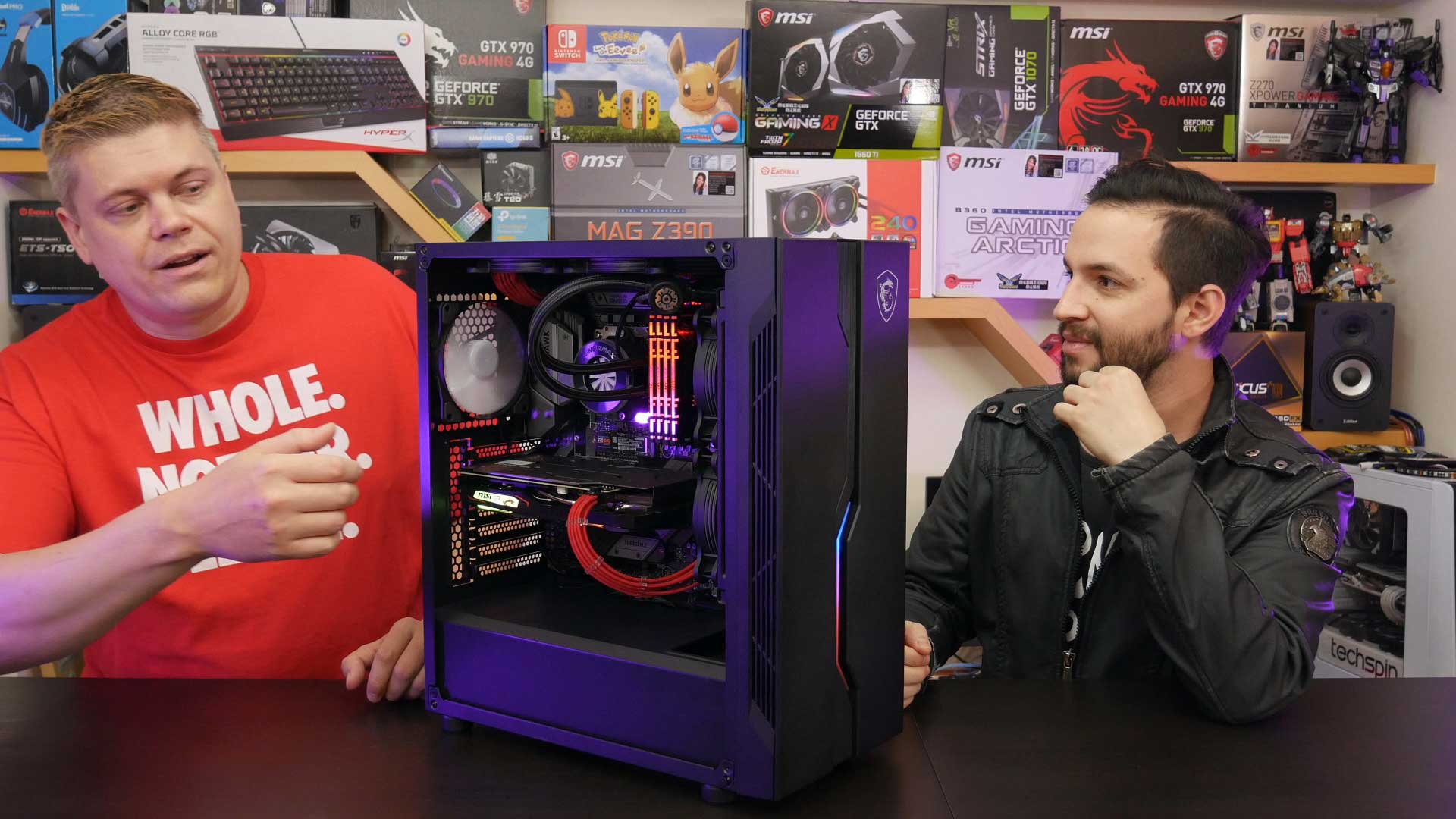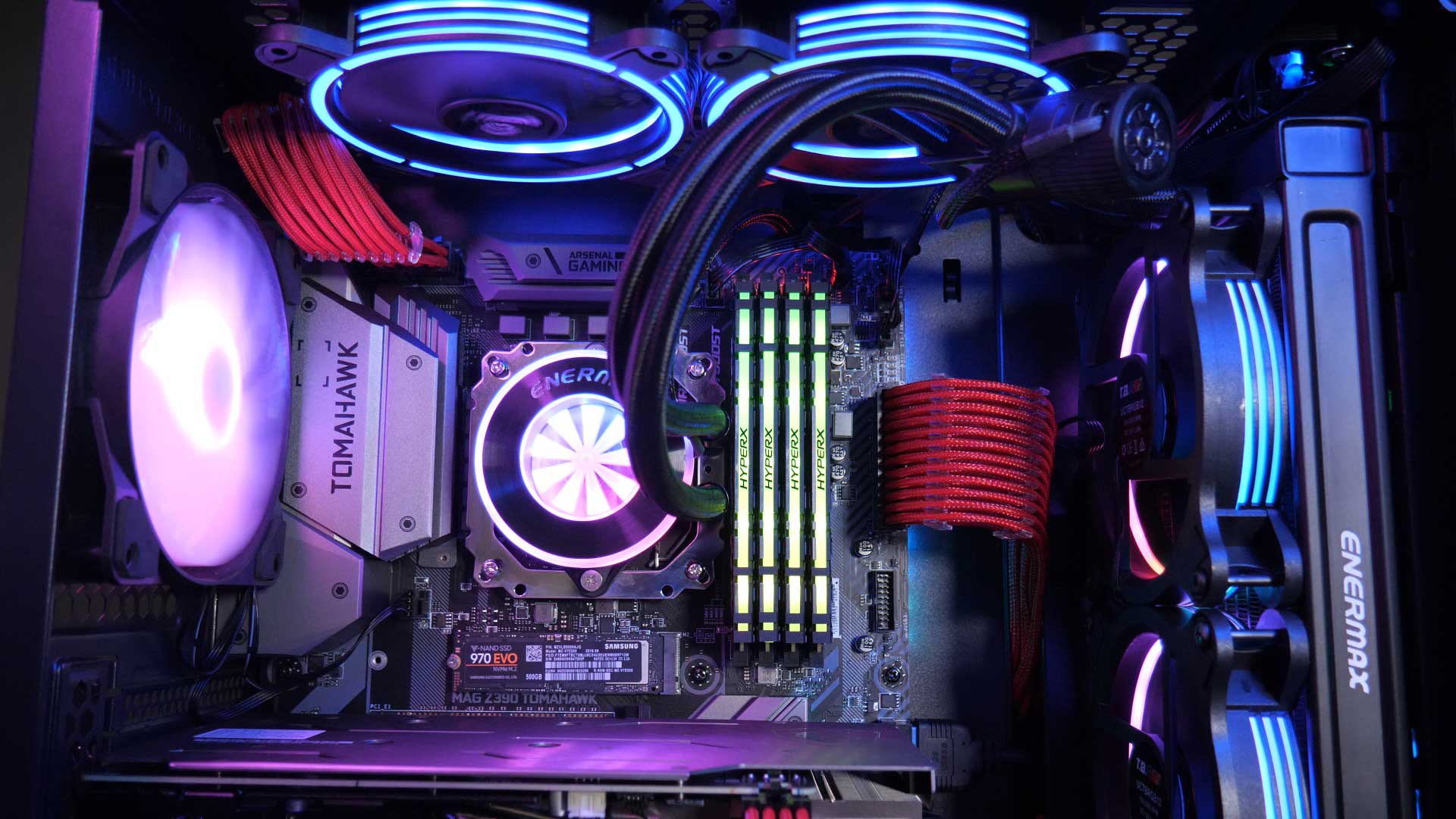 So we have the MSI MAG z390 Tomahawk with an i9-9900K, and HyperX Predator DDR4 3200 32GB that works with Mystic Light. Graphics card is an MSI GTX 1660Ti Gaming X 6GB DDR6 with a Samsung 970 EVO 500GB NVMe m.2 SSD system drive, all powered by a Seasonic Focus+ 850FX fully modular PSU.