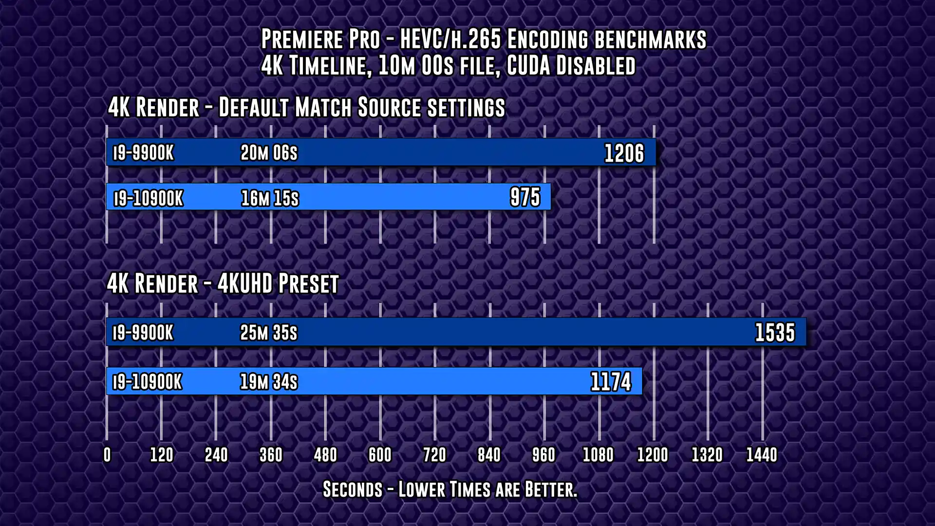 For HEVC or H265 encoding, we tried both at default match source settings, as well as with the 4KUHD preset, the 9900K ran 20 06 default and 25 35 using 4KUHD, the 10900K turning in 16 15 default and 19 34 with the 4KUHD preset. If you know what’s going on here under the hood, I’d be interested to know.