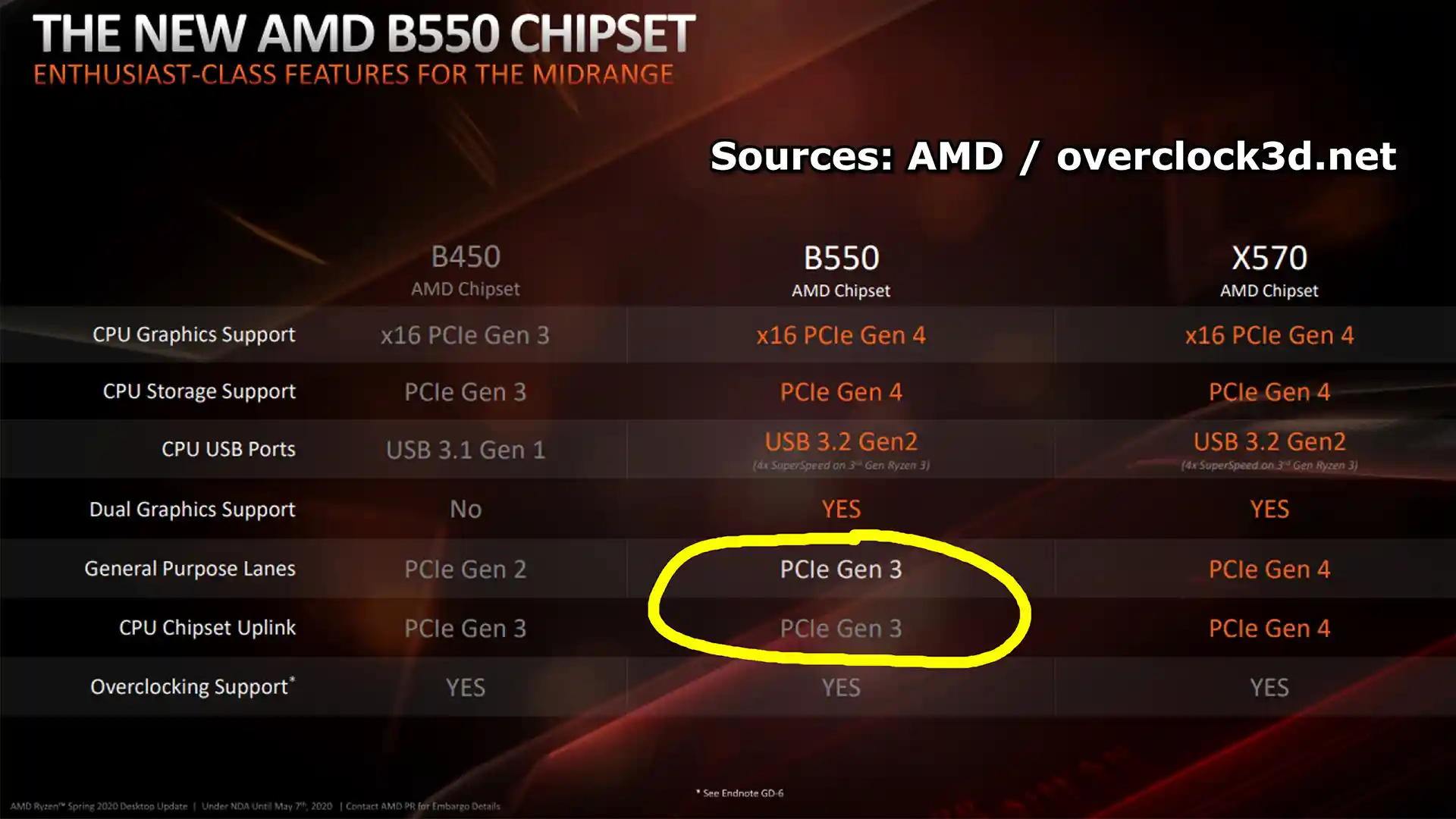 For both B550 and X570, you get PCIe 4.0×16 for PCIe/ M.2/ DDR4 with AMD CrossFire and NVIDIA SLI support, and Gen4 M.2 NVMe SSDs and USB 3.2 Gen 2. The difference for B550 is the PCIe 3.0 link to usb and sata which limit USB quantity and speeds depending on the manufacturer, though the matured VRM designs often match their higher end X570 counterparts, starting around 110 to 120 dollars.