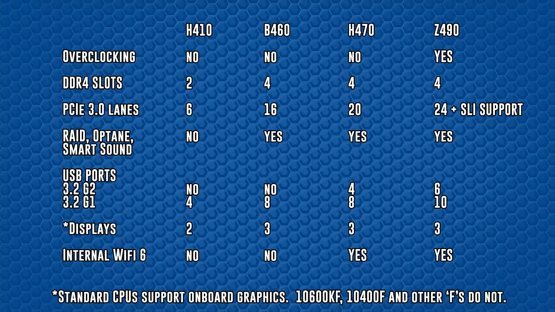 The H470 still no overclocking, now with 20 PCIe 3.0 lanes, adding 4 USB 3.2 Gen2 ports, and integrated Intel Wi-Fi 6. These motherboards start around the 120 to 140 dollar mark. Finally the Z490 chipset supports overclocking, increases PCIe 3.0 lanes to 24; also USB 3.2 Gen2 goes to 6 ports, and 10 ports for Gen1. With Wi-fi 6, the Z490 is the only chipset that supports SLI, and these boards start around 160 to 190 bucks.