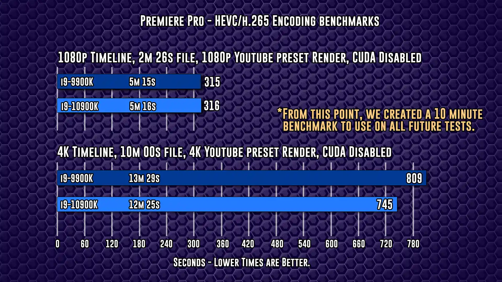 If you’re working with Premiere, we saw something funky with 1080p vs 4K content, with CUDA off, our previous 2 minute 26 second test file on our 9900K originally finished at 5 minutes 07 seconds, today that render takes 5 minutes 15, the Intel security bug fixes evidently take a tiny hit on speed, if it’s something else let me know in the comments. The 10900 fresh install does 5 minutes 16, actually a hair slower, and this is rendered with Premiere CC 2019. 2020 adds 15 seconds to the render.