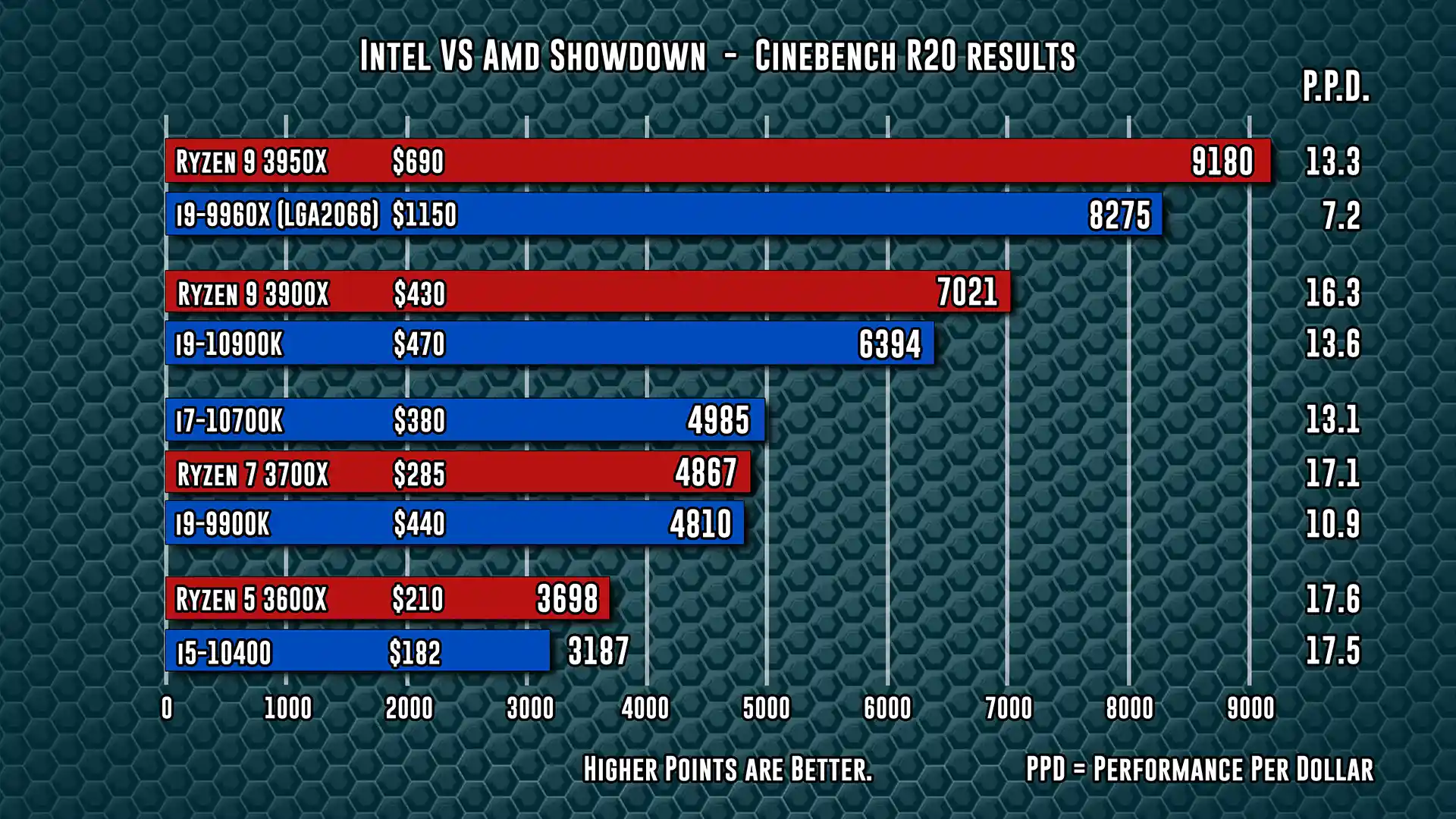 Here’s our Intel VS AMD showdown, again, Cinebench isn’t a definitive ranking, just an easy way to compare performance quickly between CPUs and tiers. So starting at the low end, the i5-10400 at 182 does 3187 in R20, facing off against the Ryzen5 3600X at 210 for 3698 marks. PPD is Performance Per Dollar, and that’s matched here, AMD by a hair.