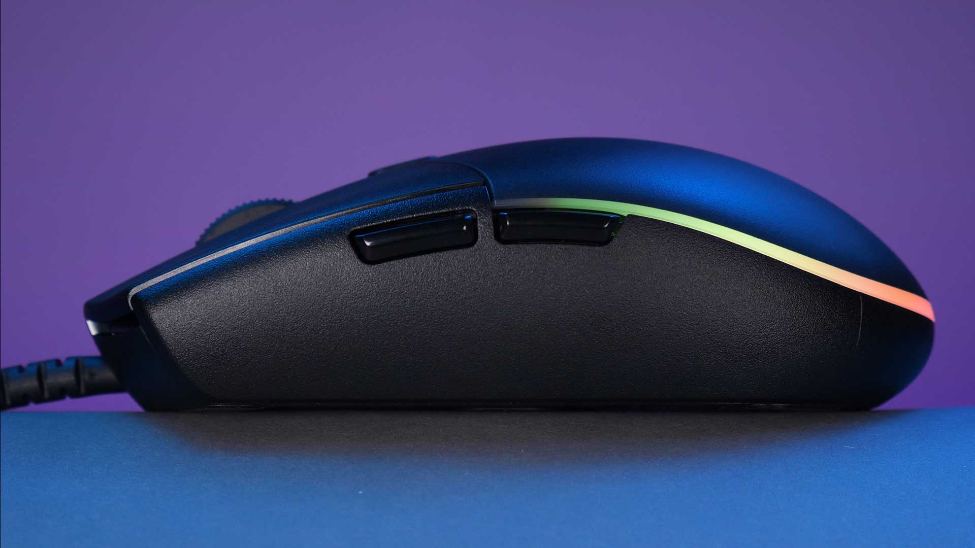 Grippy matte sides make the mouse easy to grab, and shiny black side buttons are responsive and very stable in the housing without any wobble.