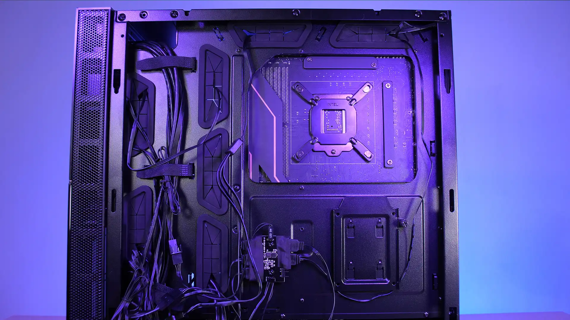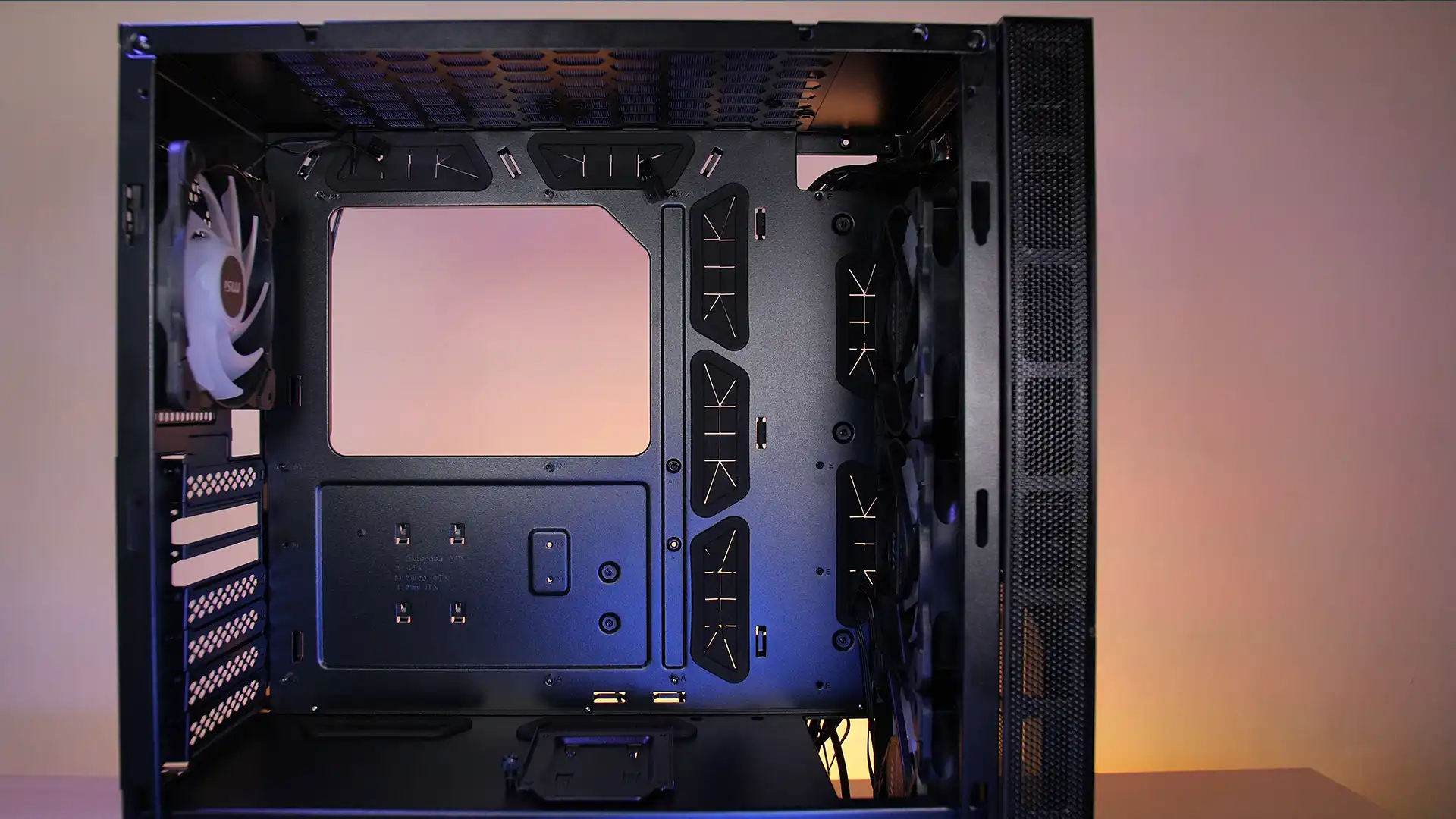 The back of the motherboard tray has one spot for an SSD, the other spot is taken with the ARGB hub that is pre-wired, and will be compatible with other 5 volt 2-space-1 pin ARGB motherboard header and strip lighting.