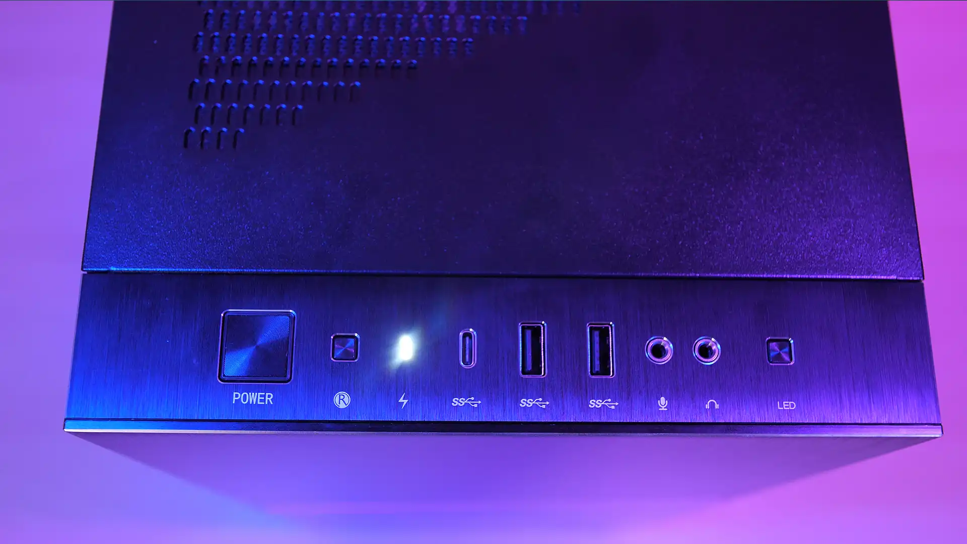 The top front I/O panel has a nicely finished square power button, a reset button and a single white LED to indicate power. Here’s the USB 3.2 Gen 2 Type-C, along with 2 Gen1 Type-A and HD audio jacks, and an LED control button.