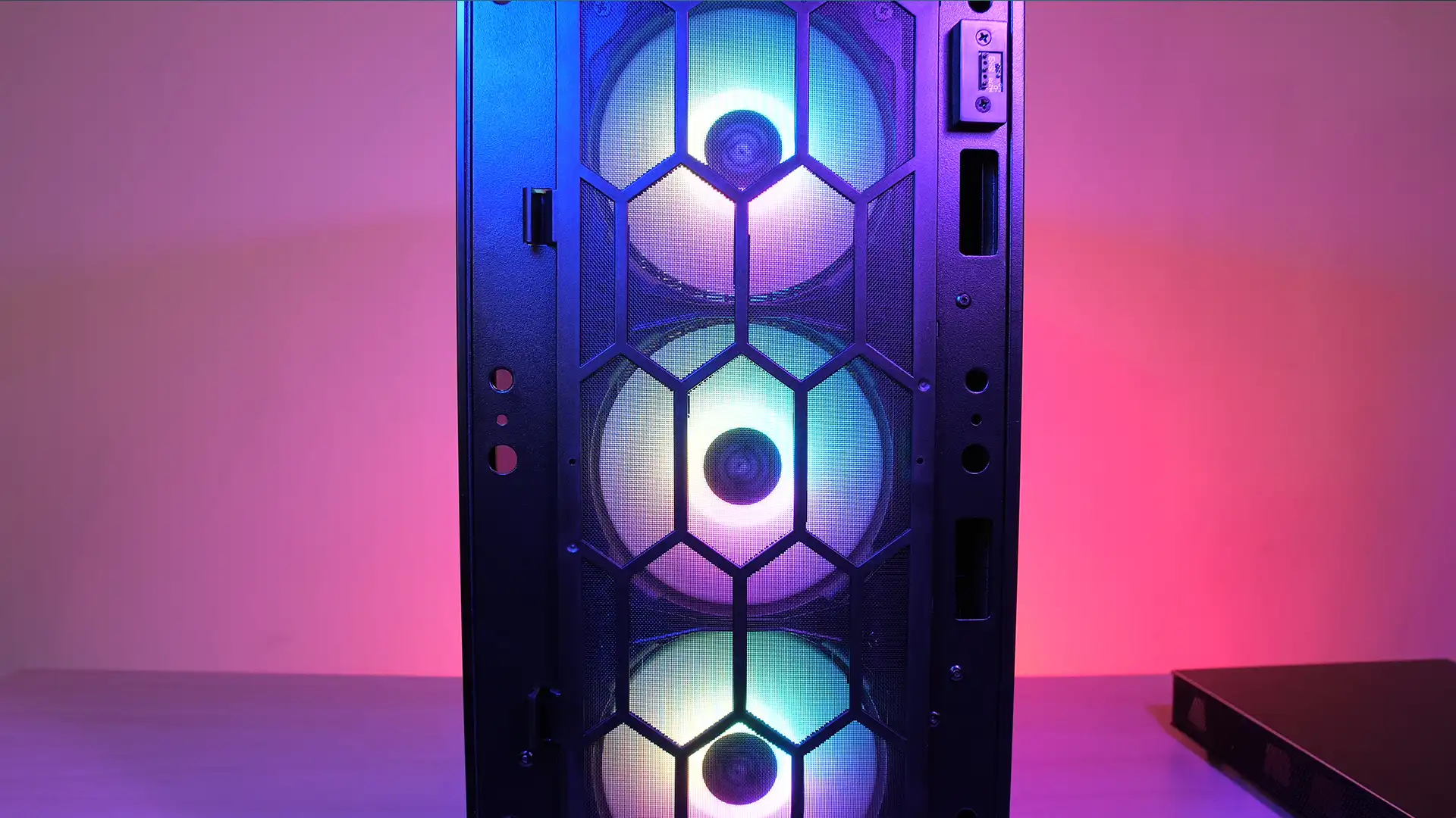 Four ARGB fans are installed, three in the front, of which one and a bit are visible behind the half height TG panel. The other is mounted at the back, and this compact mid-tower can handle E-ATX, ATX, M-ATX and Mini ITX motherboards, supporting GPUs up to 34 cm in length. Max CPU cooler height is 170 millimeters, and there are rubber grommets on every pass-through.