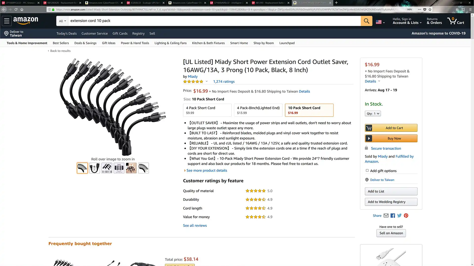 UL Listed Short Power Extension Cord 16AWG/13A, 3 Prong (10 Pack)