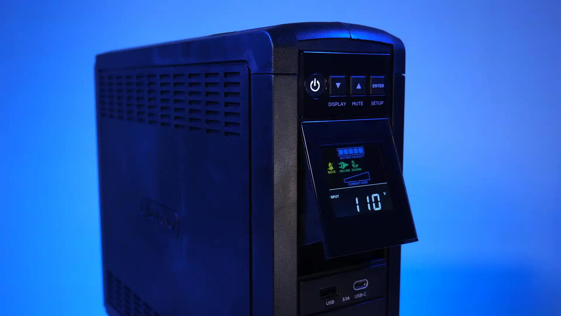 Additional features of the intelligent LCD: displaying input and output Hertz, output kilowatts, volt-amps and amps, along with kilowatts and volt-amps percentages. There’s a slight bit of light bleed from the segments which barely catches other elements in the LCD display. Powerpanel personal is the software that interfaces with this model.