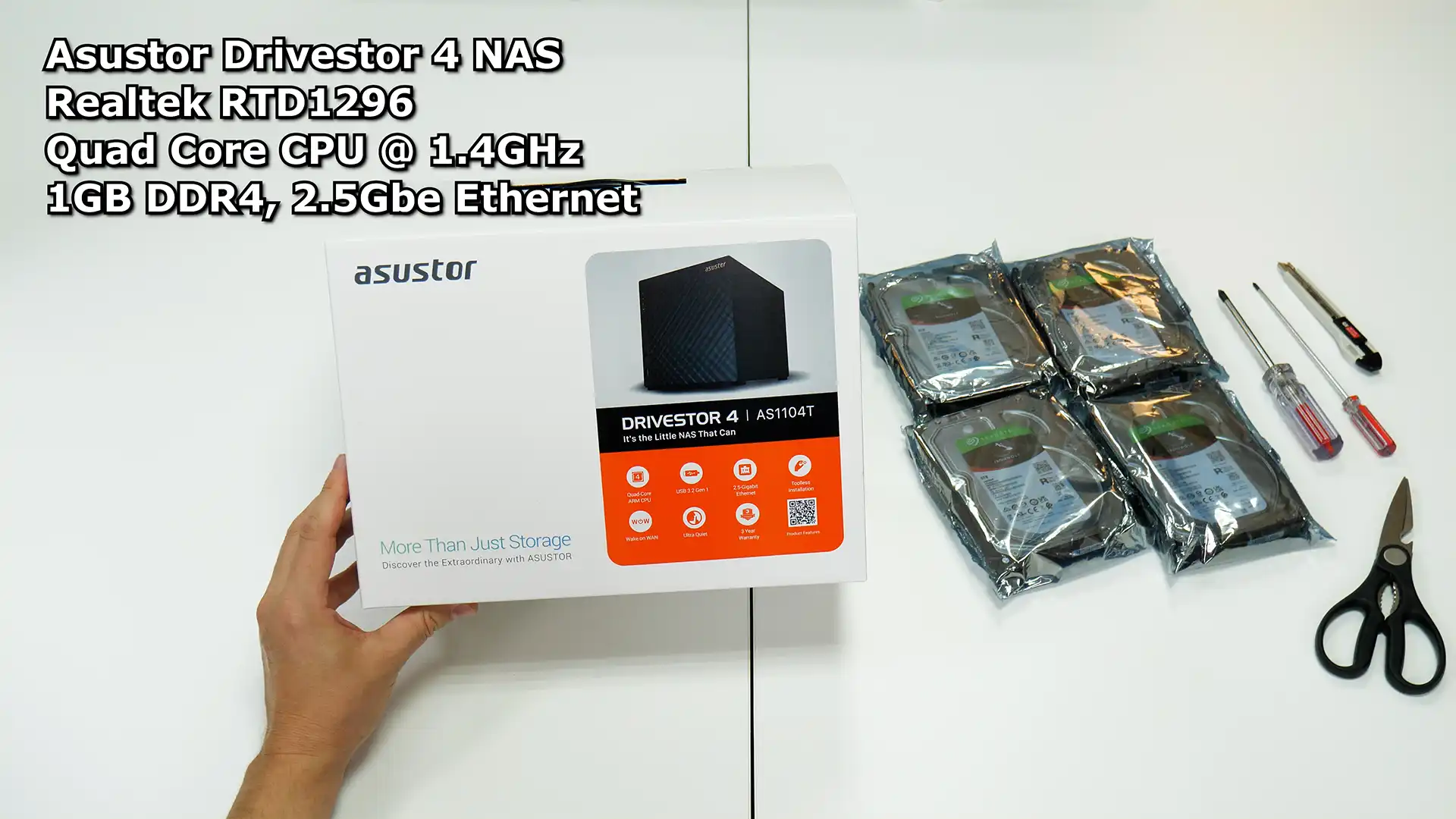 So this Asustor Drivestor 4 handles up to 4 NAS hard drives, with a Realtek RTD1296 Quad Core CPU at 1.4 Gigahertz and 1 gig of DDR4 ram, with a fast 2.5 gigabit Ethernet port. We have four 6 terabyte Seagate Ironwolf NAS drives, thanks to Asustor. Let’s open up the box. Inside is the box with cables, and the Drivestor 4 NAS is pretty well padded with lots of foam and plastic wrap to protect it in shipping. Peeling off the front plastic we get to see the patterned front.
