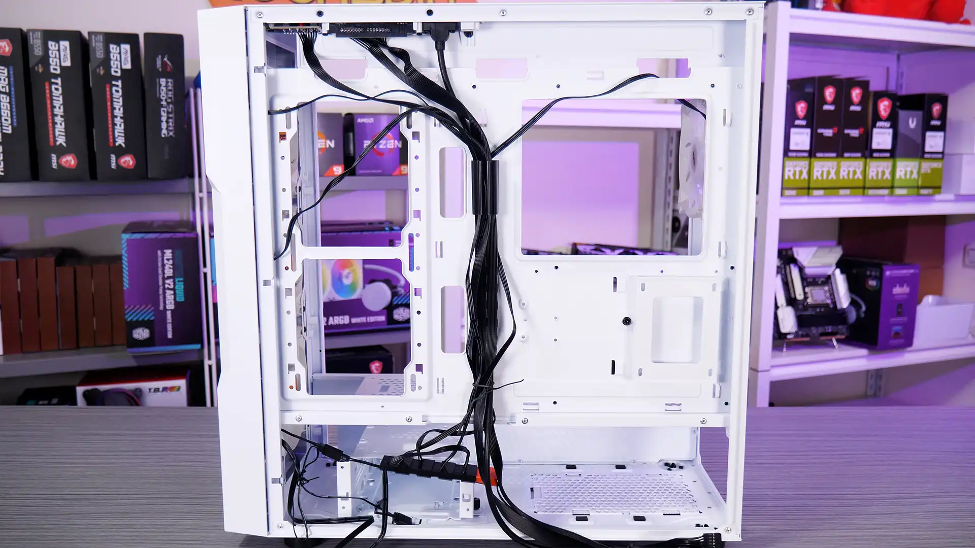 The same page also says a Cable Grommet is included, and shows a closeup of a hole, also called… a cutout. For reference darkFlash, a grommet looks like this: and there’s none included with the case. The top of the motherboard tray has 3 wiring cutouts which are easily accessible thanks to the headroom, but just a little too small.