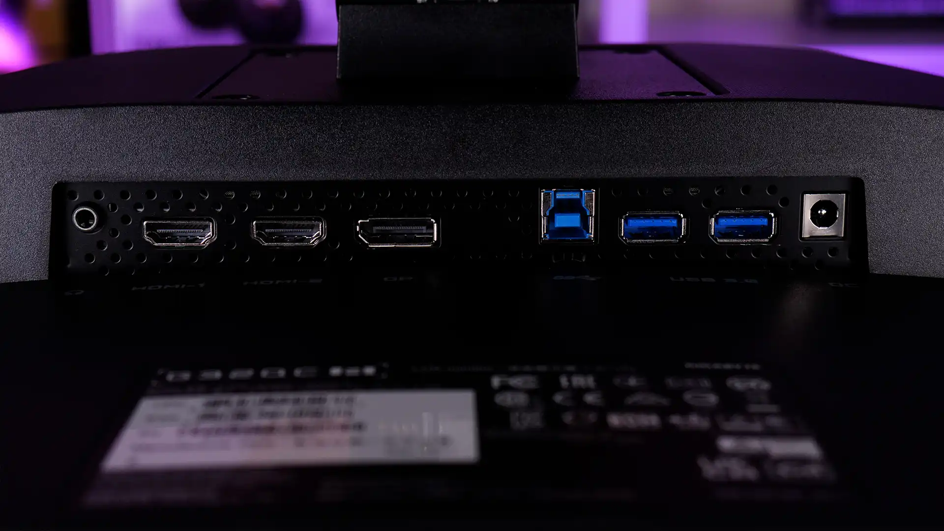 It has two USB 3.0 ports with upstream and software control. Cables in the box were power, the too-short upstream USB, an HDMI and a DisplayPort cable. This Gigabyte G32QC-A 165Hz can be mounted with the standard 100 millimeter VESA mounting holes, and the right side has a 5-way joystick for control but unfortunately they forgot the power button, which comes in really handy if you’re troubleshooting display issues.