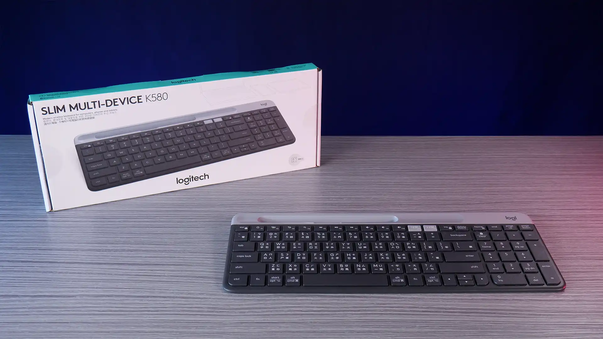 While the K780 has improvements over the K580 such as 3-device Easy Switching, an open cradle design to fit any size device, and the new round-shaped key style, it’s also over 50% heavier at 875 grams. So you can get this lighter version at a discount. Obviously key markings will vary by region, our Taiwanese version has extra Chinese symbols.