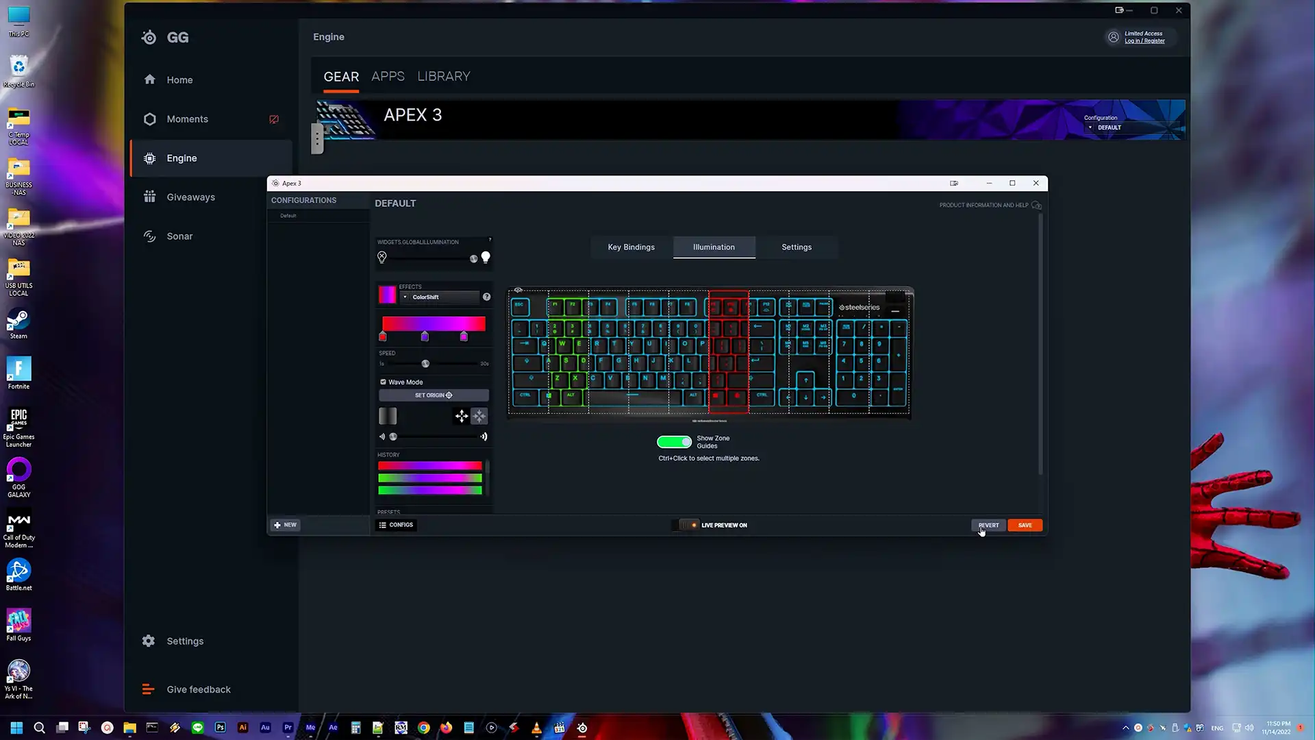 The SteelSeries Apex 3 uses their Engine 3 software for Windows and MacOs, and luckily you aren’t required to register to start using it. It’s fairly simple and intuitive to select your device and start configuring. With preview enabled, you can adjust 10-zones of RGB with immediate visual feedback, and there’s apps like PrismSync, Discord and Audio Visualizer, and some games can give in-game RGB feedback. And default polling rate is 1000, you can lower this to 500, 250 or 125 times a second.