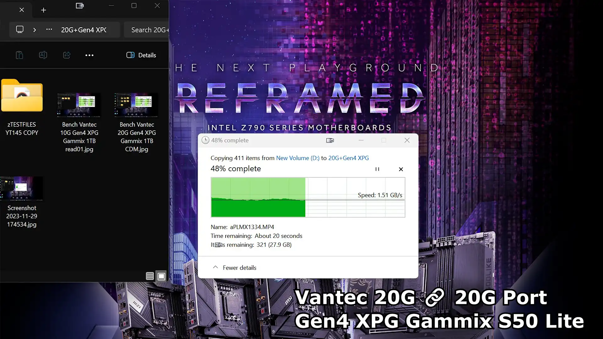 However the Vantec NVMe 20G and Gen4 XPG S50 Lite combo show some hope with 2036 and 1927 in Crystal Disk Mark. File transfer read starts with 1600 Megs-a-second dropping slightly to 1460 by the end. Writes seem interface-limited, starting at 1090 and maintaining that almost to the end, where it drops to 1000 as it finishes.