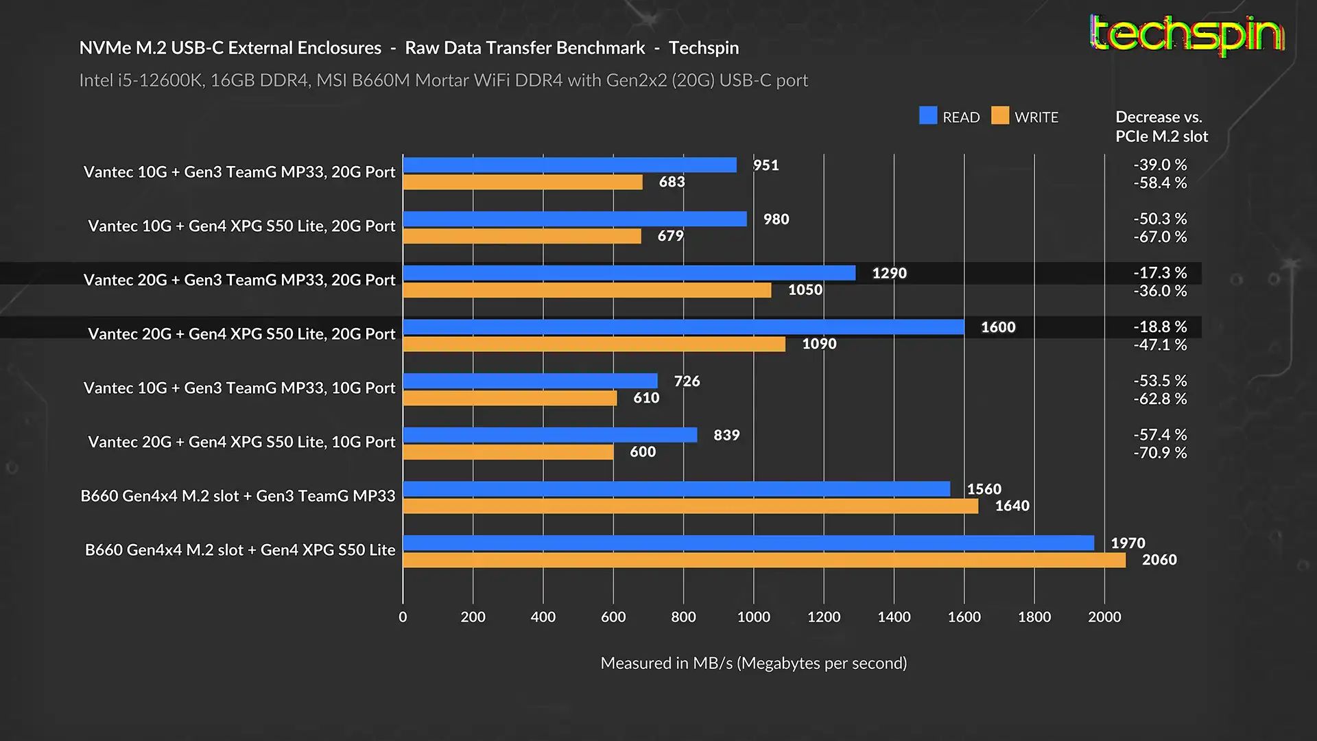 With a common USB-C 10G connection, there’s a 53 to 57% read performance drop compared to full speed, and a 63 to 70% decrease for writes. Using this for media and large files, you’ll find you probably have hardware limitations and will likely need to get a 20G port or possibly even look at USB4. So it makes sense to plan ahead with a 20G enclosure at least.